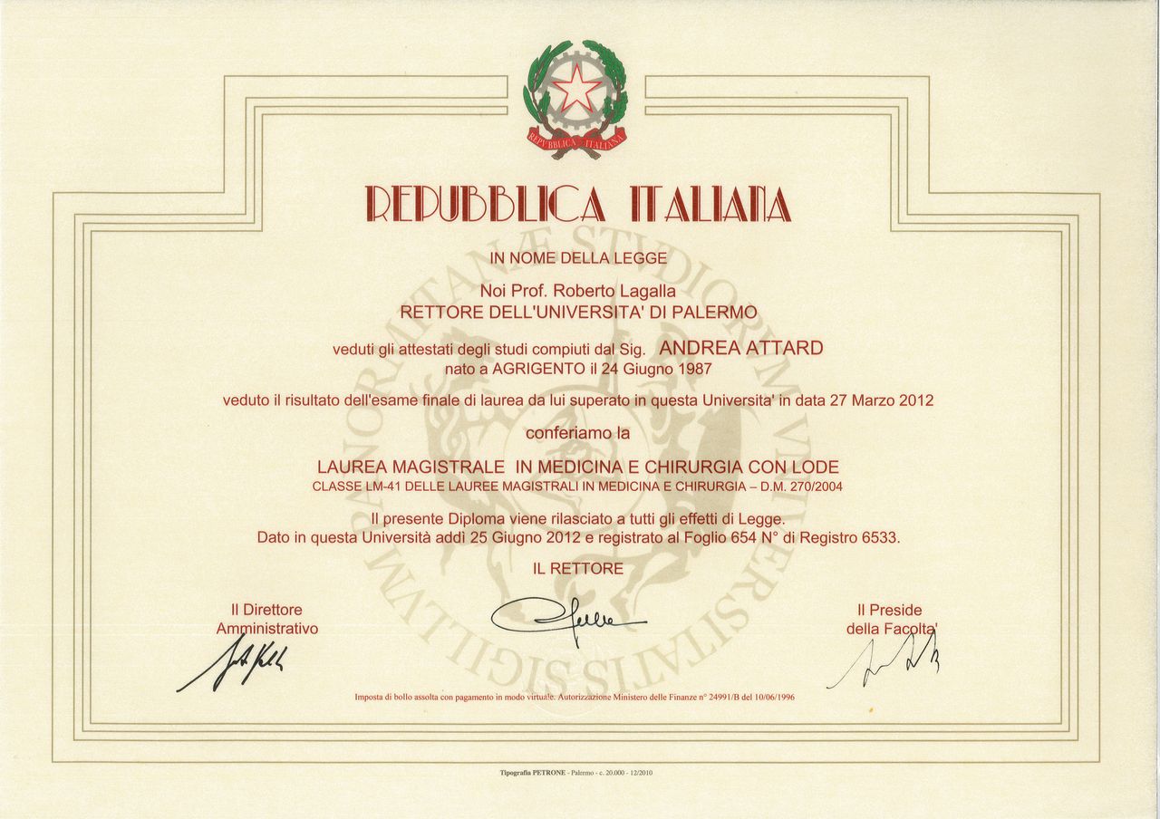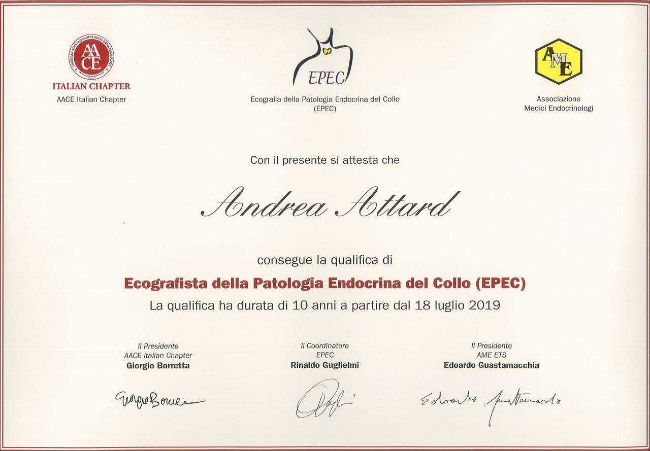 Ho completato la mia formazione tra Italia e Francia, frequentando centri di eccellenza internazionali e conseguendo diplomi di perfezionamento in chirurgia endocrina, chirurgia mininvasiva ed ecografia del collo.